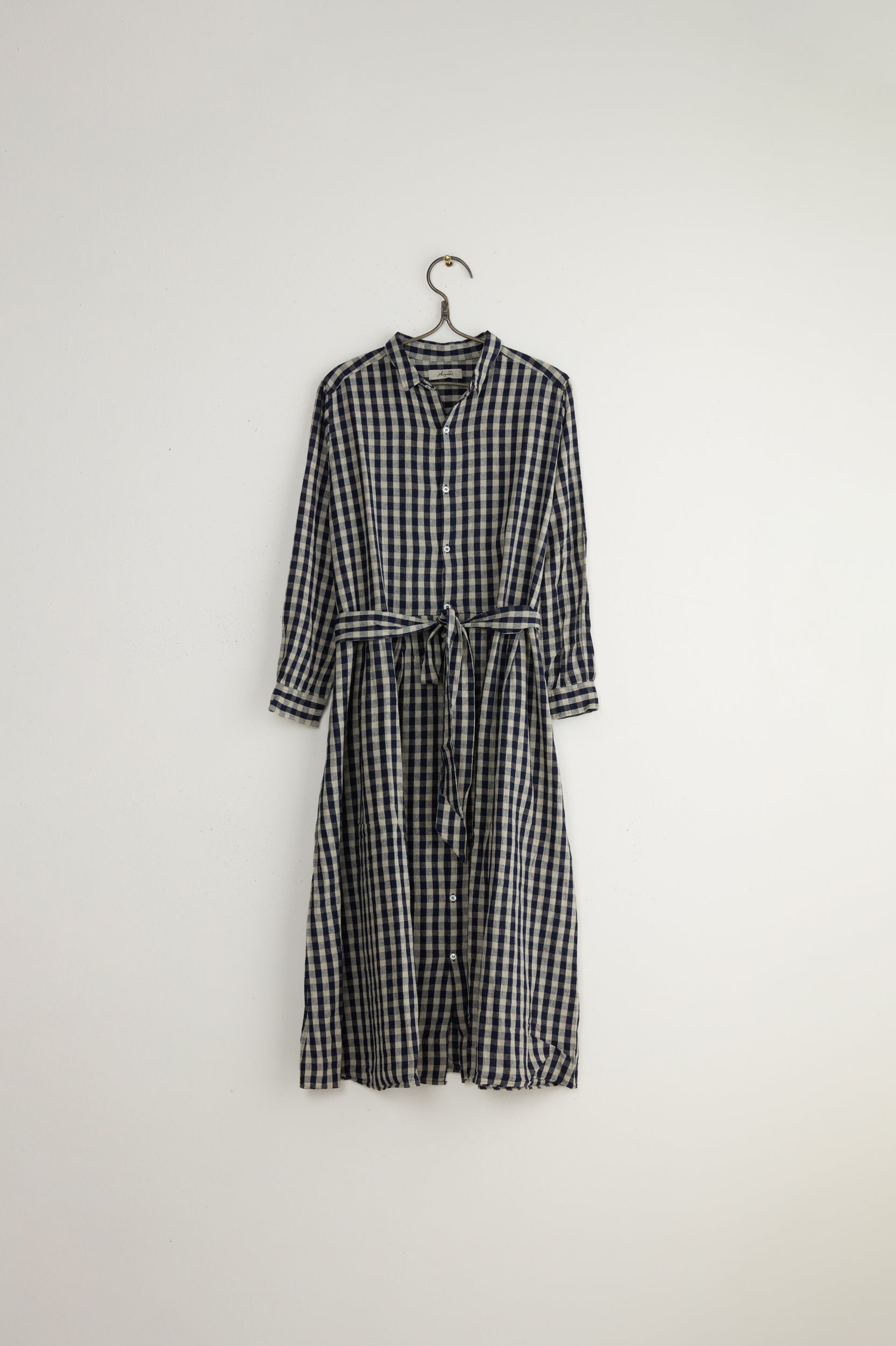 L\C Gingham Dress by Ichi Antiquités. A long buttoned dress made of lightweight linen cotton blend with gingham check pattern. A relaxed silhouette with tucks at the waist, a removable tie belt, long sleeves, a narrow collar, side seam pockets and button closure on the cuffs and front.