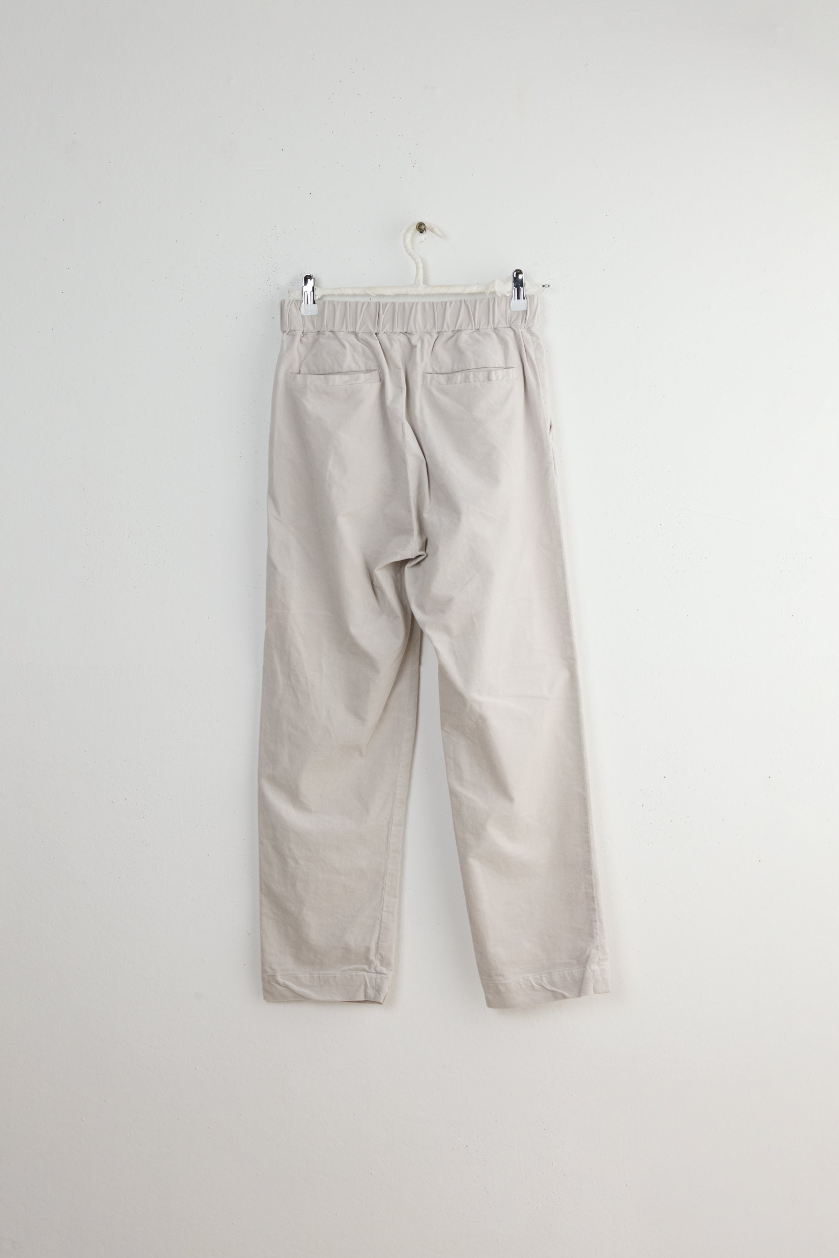 TOUJOURS Narrow Easy Trousers. Slim legged everyday trousers made from a stretchy, lightweight cotton-viscose velvet. A regular, tapered silhouette with an elastic waistband, mock fly with button fastening and both side slash pockets and back welt pockets.