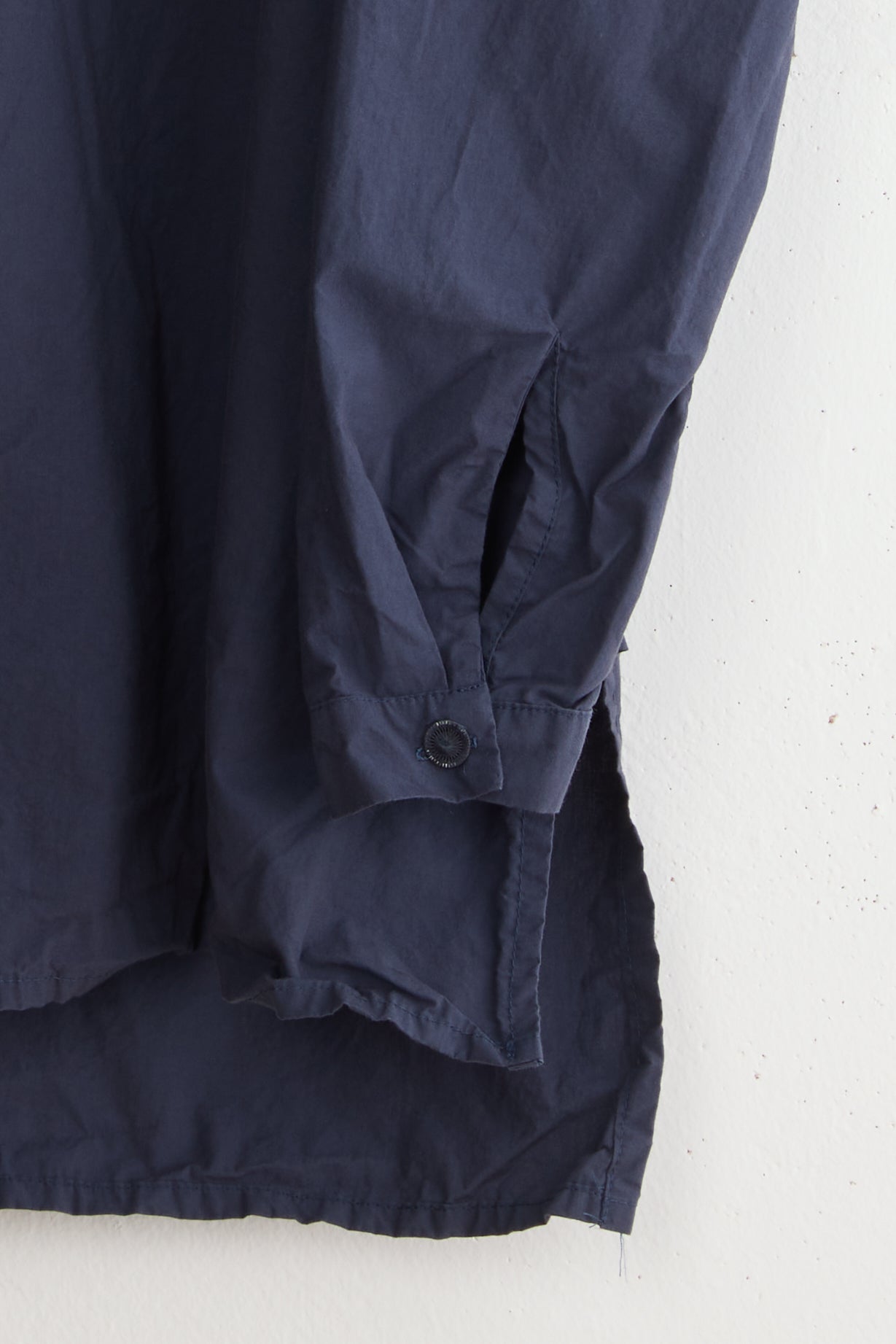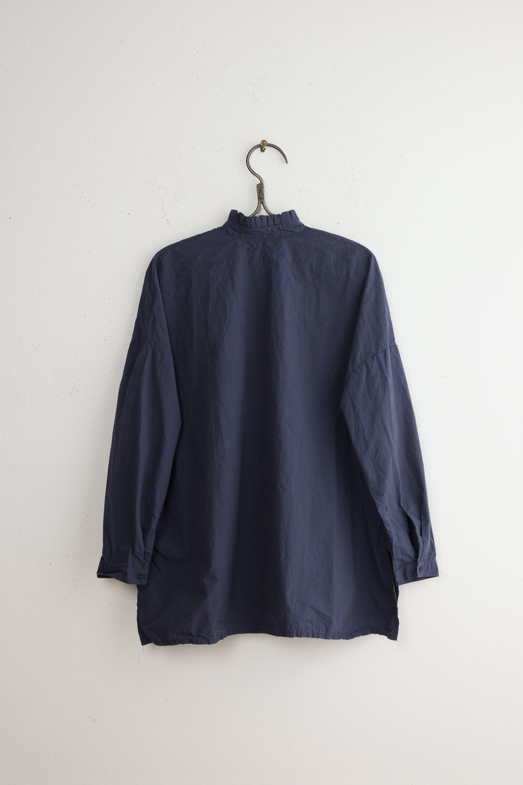 Anthony SLV shirt by Maya Zukerman is a light and crisp collar shirt made of 100% Japanese paper cotton. An oversized fit with a hand-stitched pleated stand collar. Deep, semi-closed side slits, slightly shorter on the front, hand-dyed Dorset button closure, and dropped shoulder.