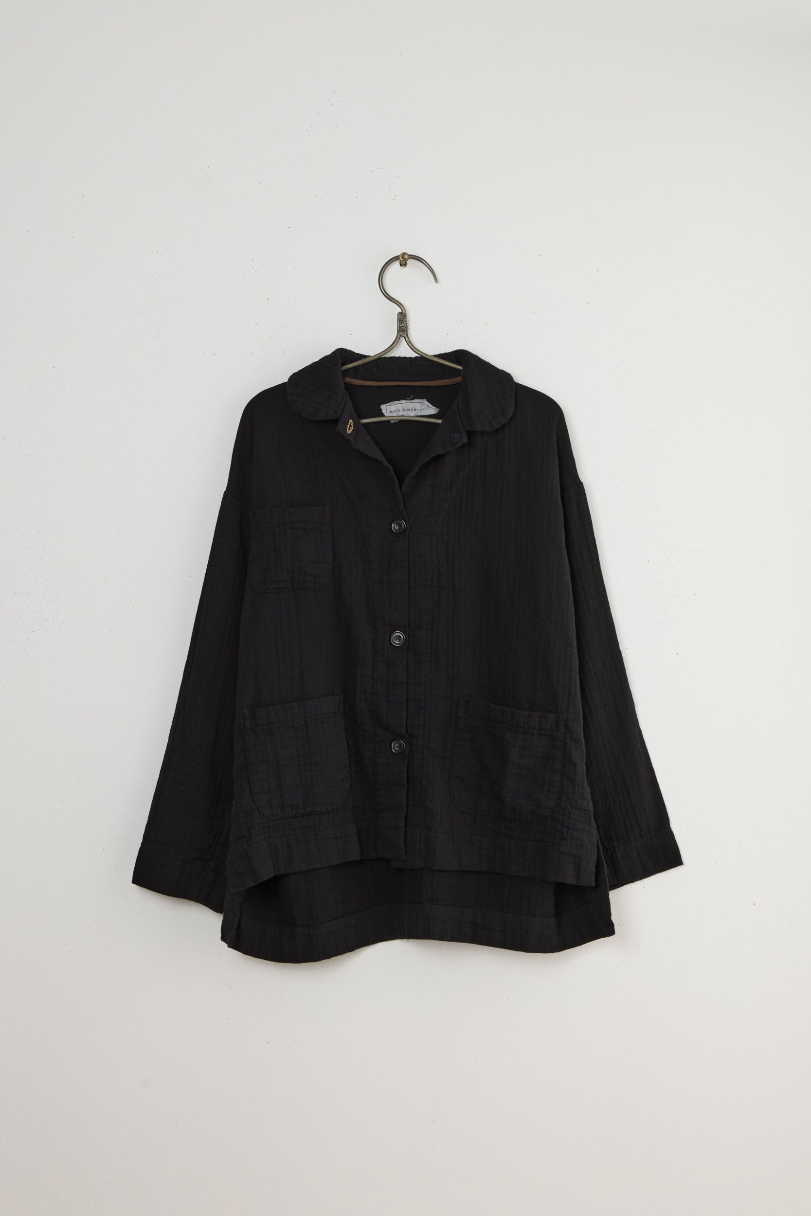 Bonn jacket by Maya Zukerman. A short and light-weight shirt jacket made from soft, textured triple guaze cotton cloth. Relaxed fit with a round collar, dropped shoulders, a shorter front side and three front patch pockets. Features Corozo buttons, hand embroidered button holes and side slits.