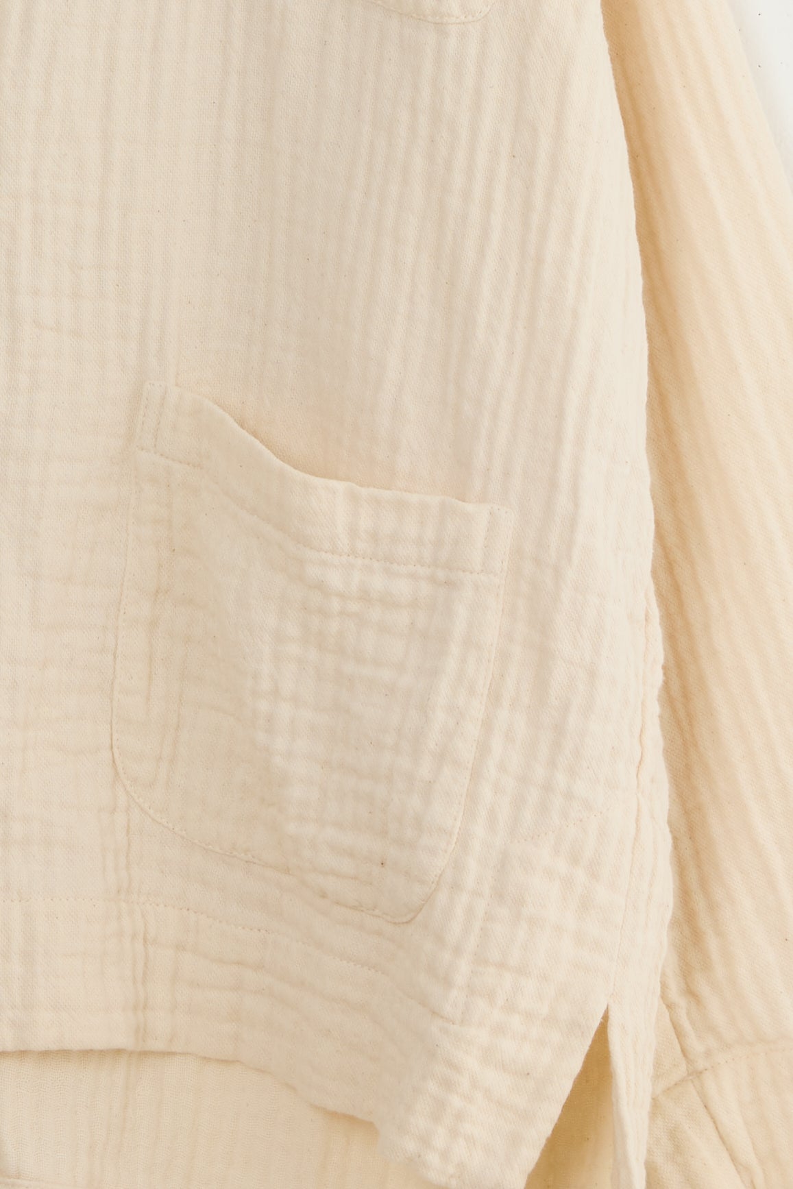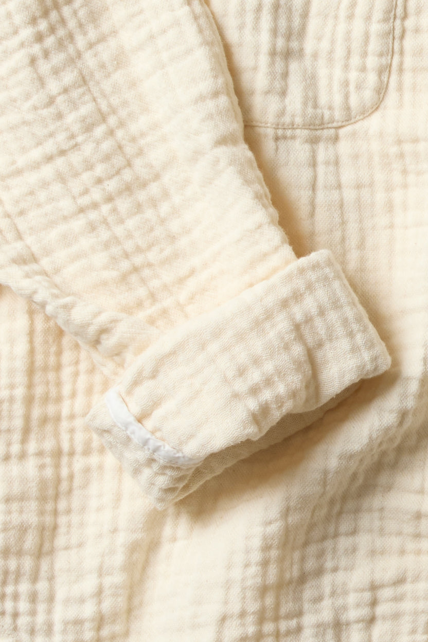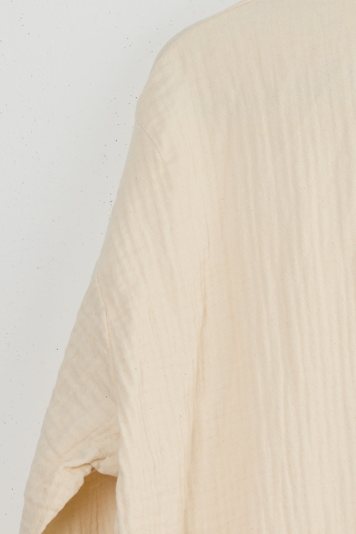 Bonn jacket by Maya Zukerman. A short and light-weight shirt jacket made from soft, textured triple guaze cotton cloth. Relaxed fit with a round collar, dropped shoulders, a shorter front side and three front patch pockets. Features Corozo buttons, hand embroidered button holes and side slits.