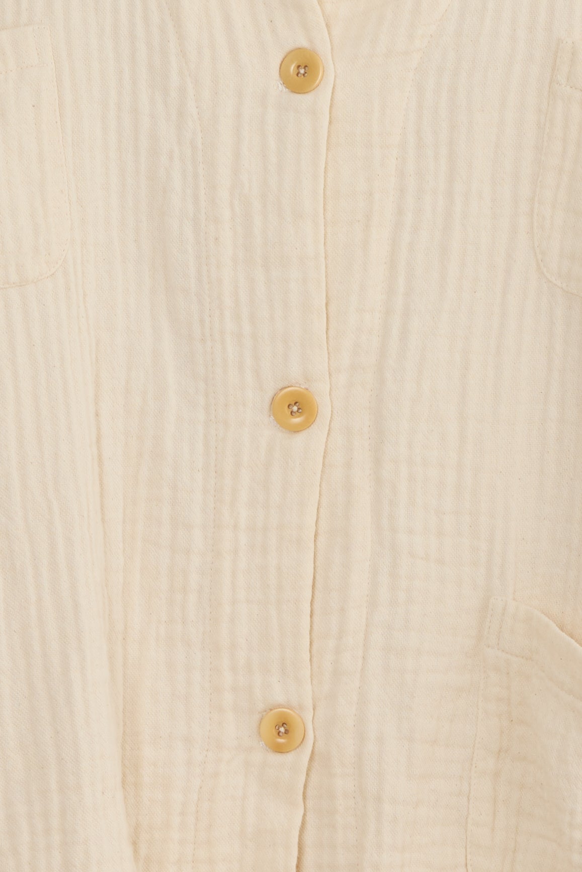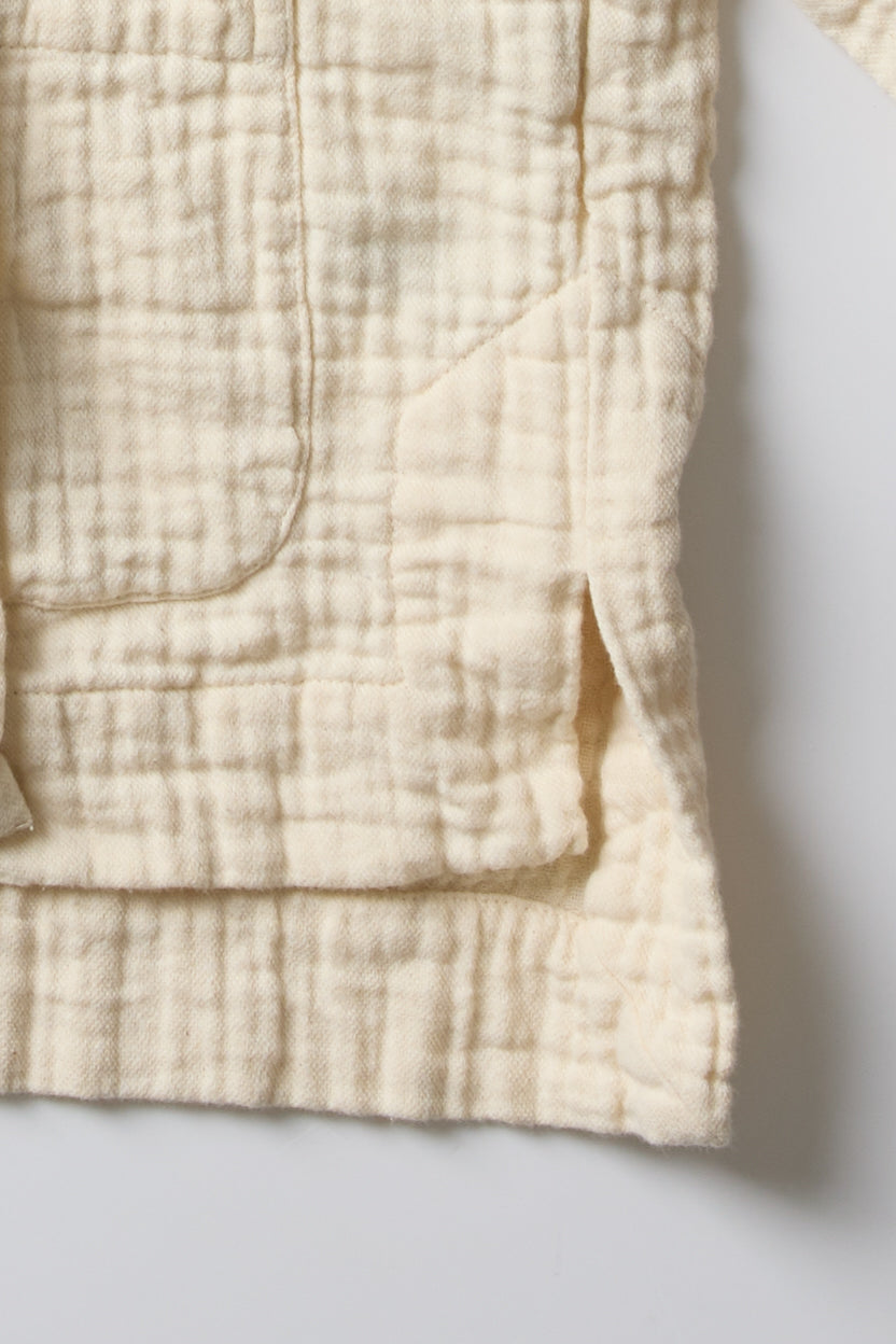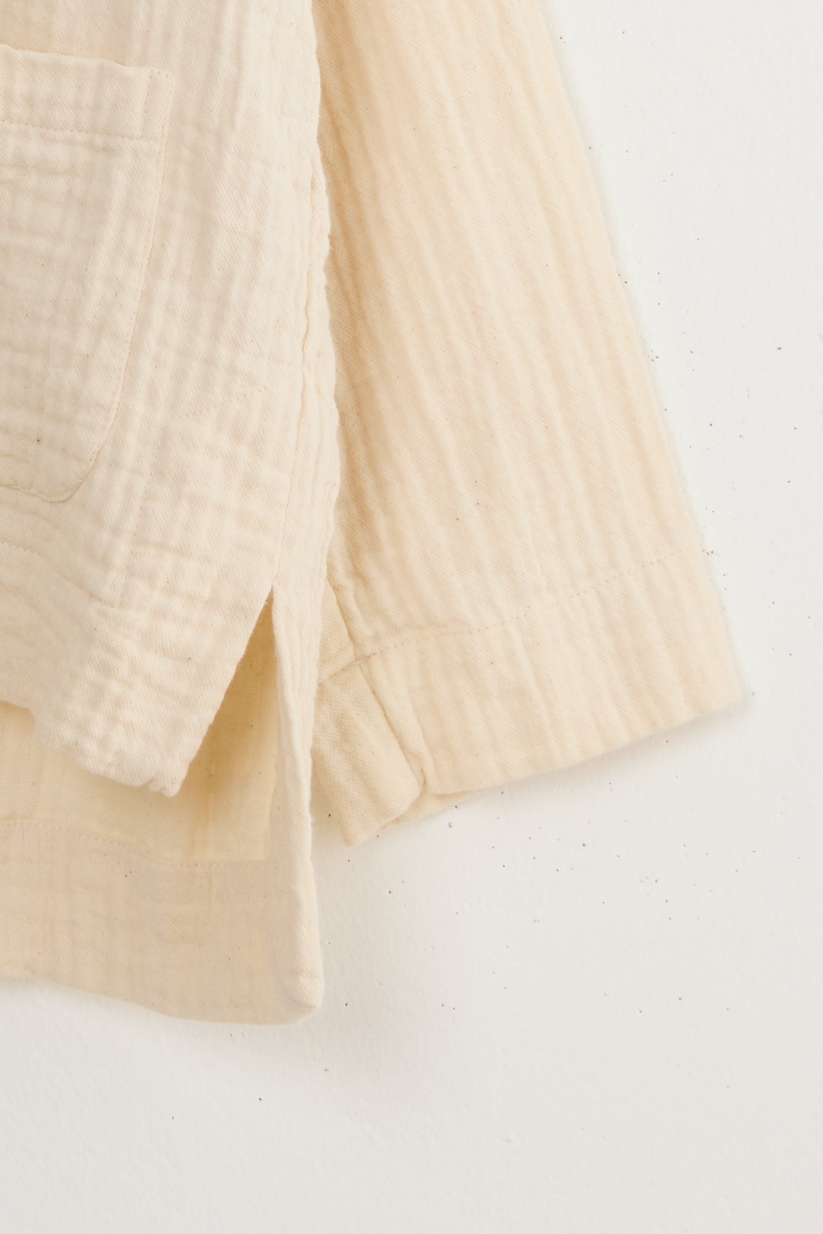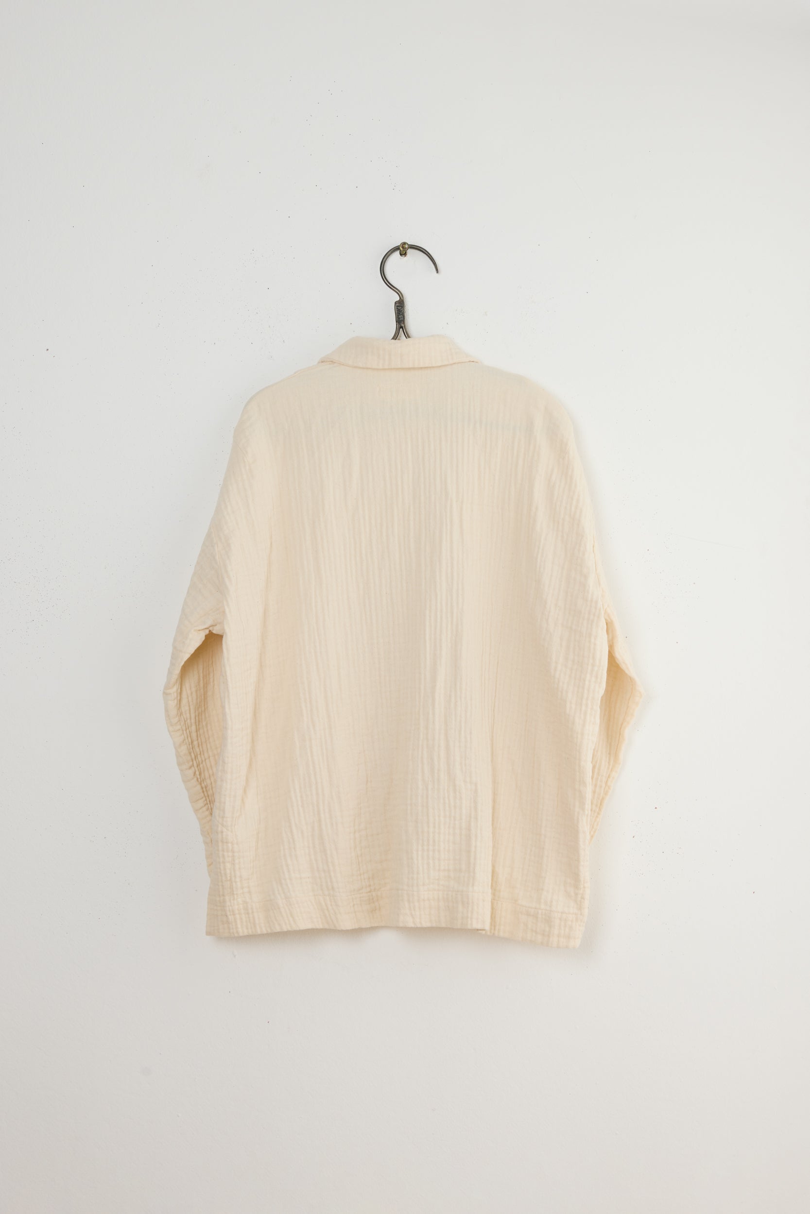 Bonn jacket by Maya Zukerman. A short and light-weight shirt jacket made from soft, textured triple guaze cotton cloth. Relaxed fit with a round collar, dropped shoulders, a shorter front side and three front patch pockets. Features Corozo buttons, hand embroidered button holes and side slits.