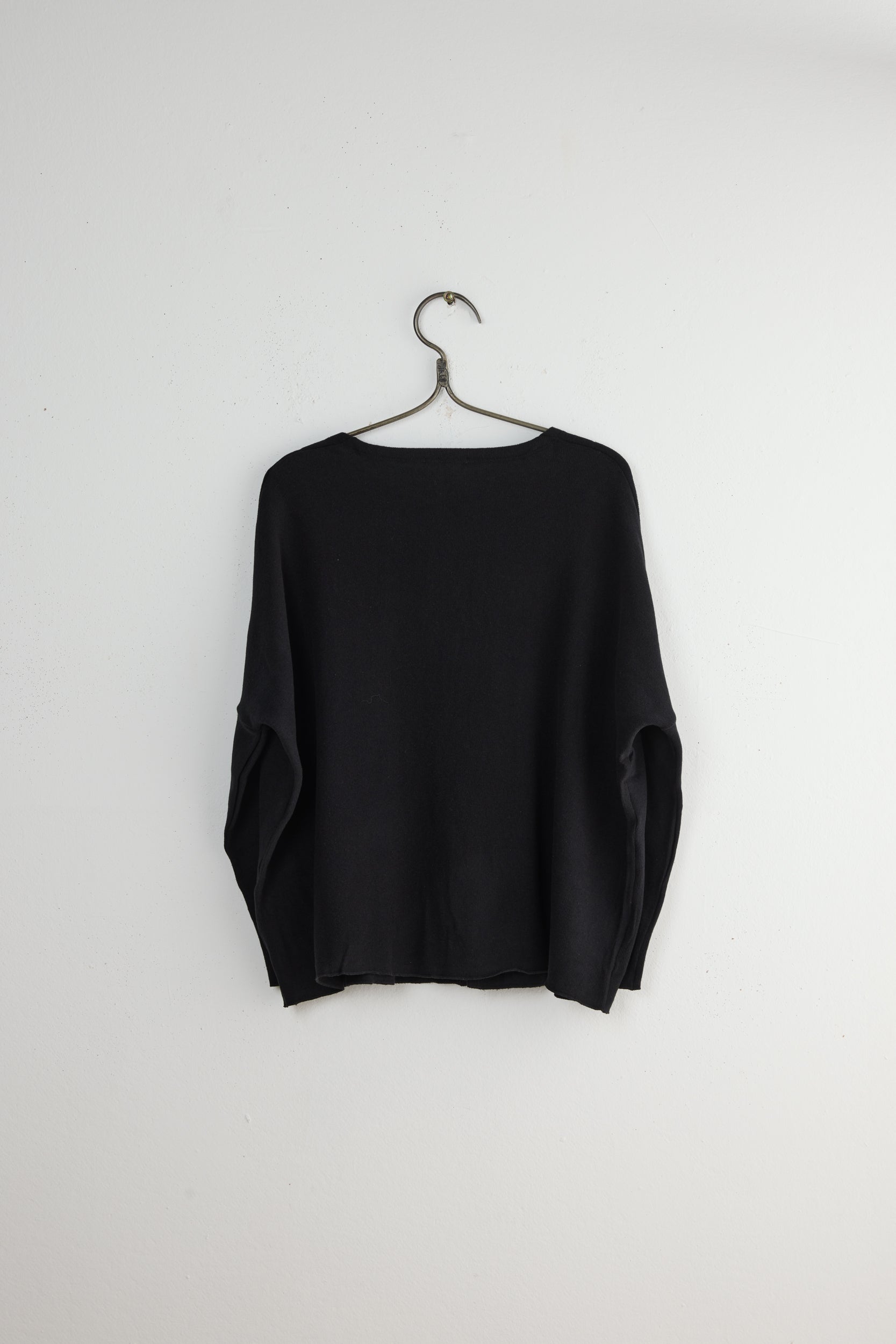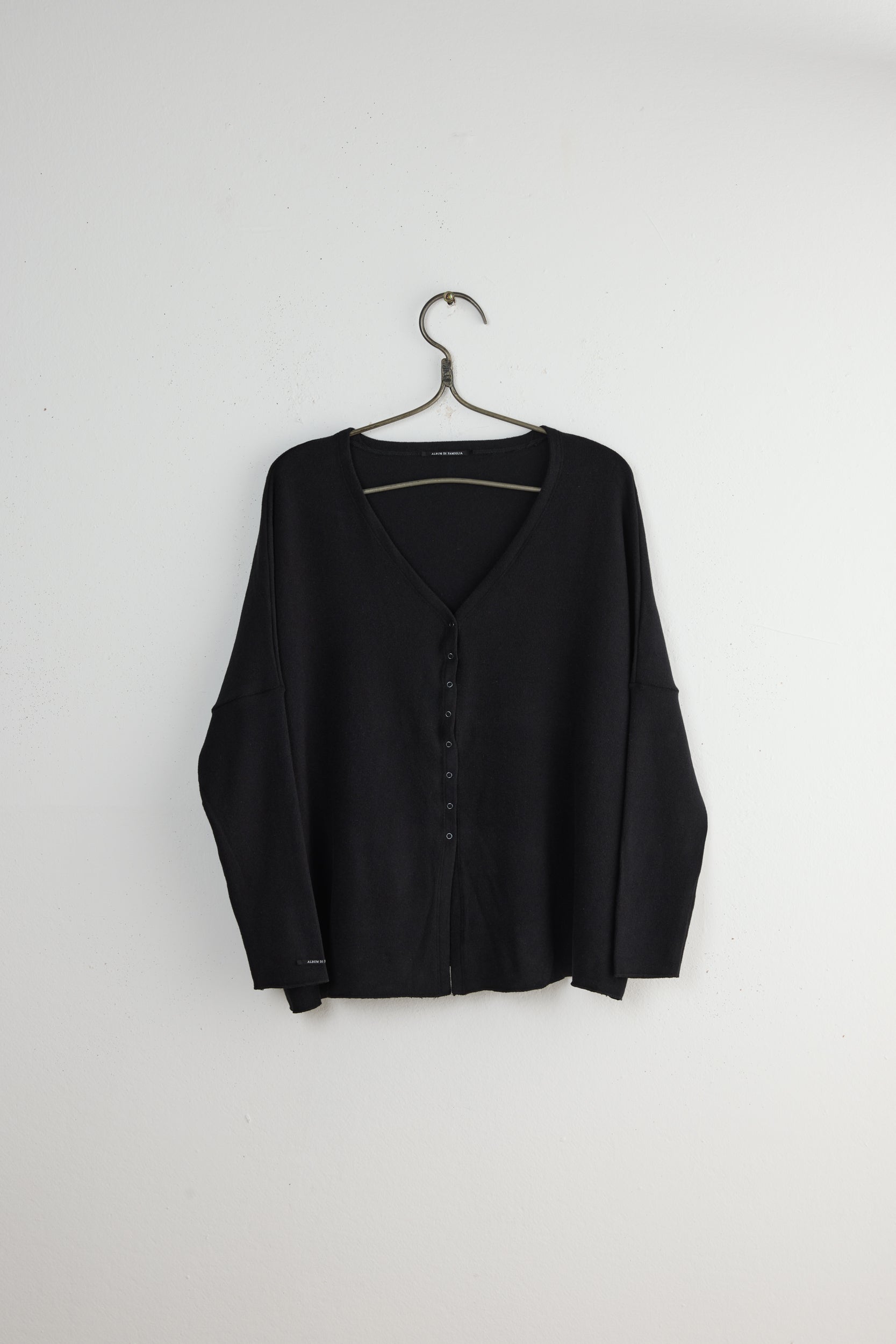 The JP Cardigan by Italian brand Album Di Famiglia. A soft and cozy heavy jersey cardigan with a boxy, wide fit and a deep V-neck. Dropped shoulders, slim-fitting sleeves, snap button front closure, and baby lock finish.