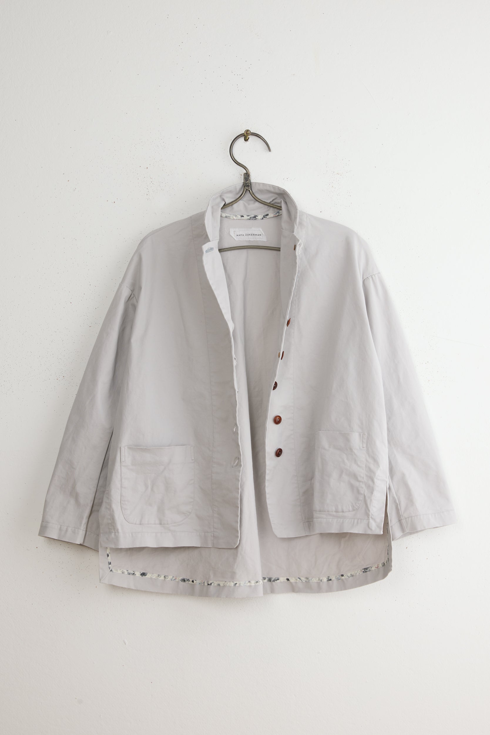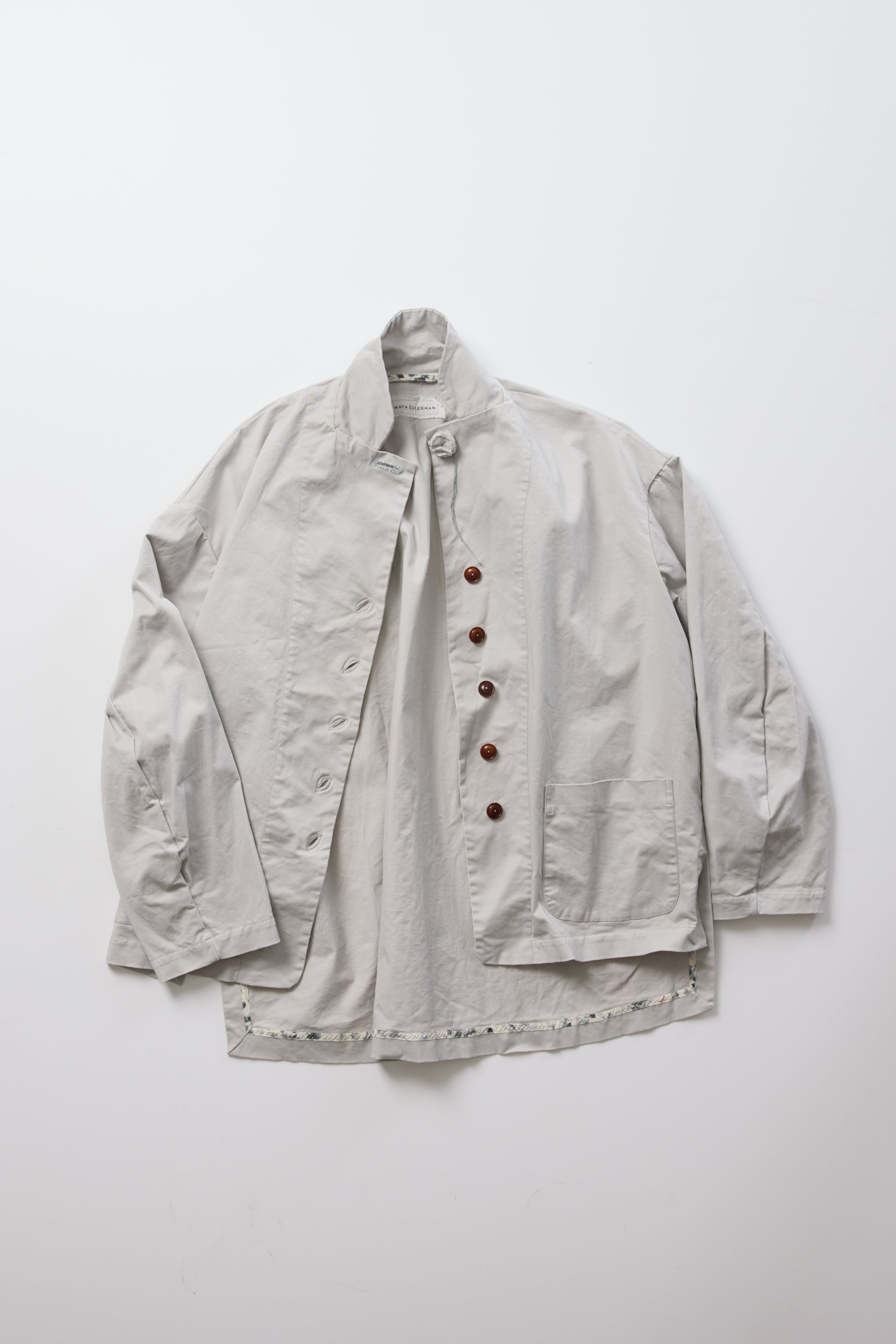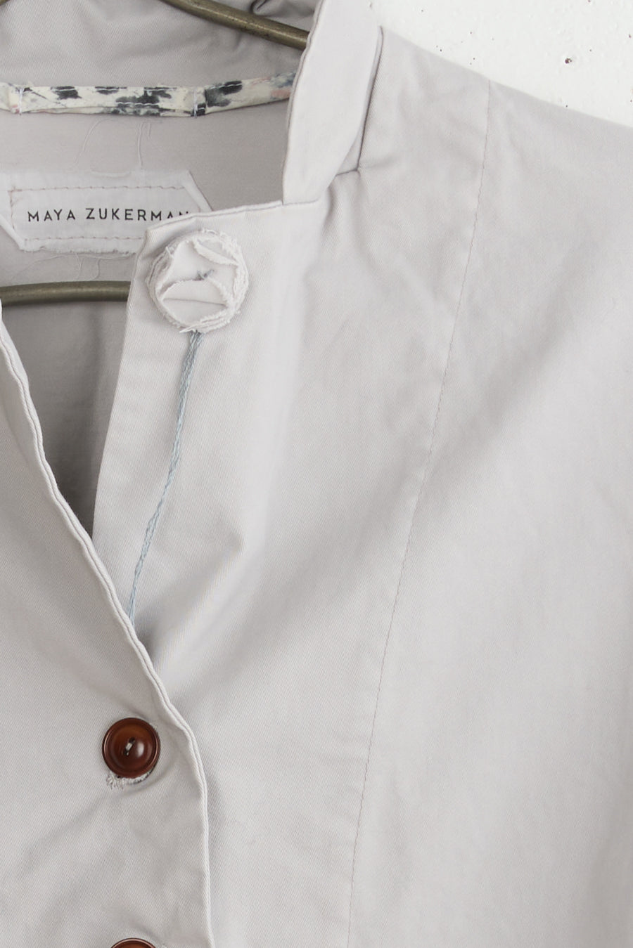 Dani jacket by Maya Zukerman. A short, light-weight cotton jacket. Relaxed fit with dropped shoulders, a shorter front side and an upright collar. Features Corozo button closure, floral inside ribbons and hand embroidered slanted button holes. The first button is made as a flower by stacking layers of the material. This jacket also has Side slits and two front patch pockets. suited especially for the hot summer days and chilly spring nights of Tel-Aviv.