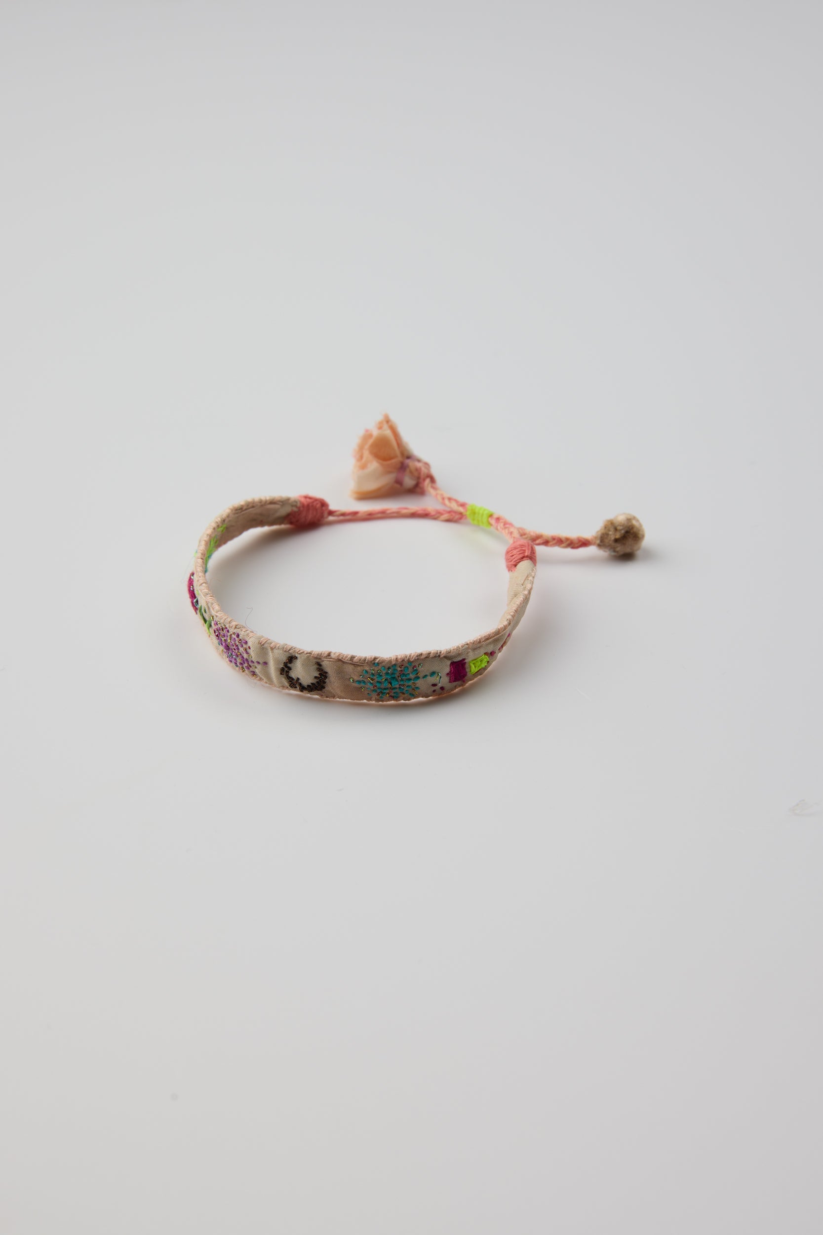 Embroidered bracelet by Antomoon. One of a kind, hand embroidered colorful bracelets made from hand dyed recycled silk from a sari. Embroidered with lovely little characters and motifs. Adjustable strap with a flower-like finish.