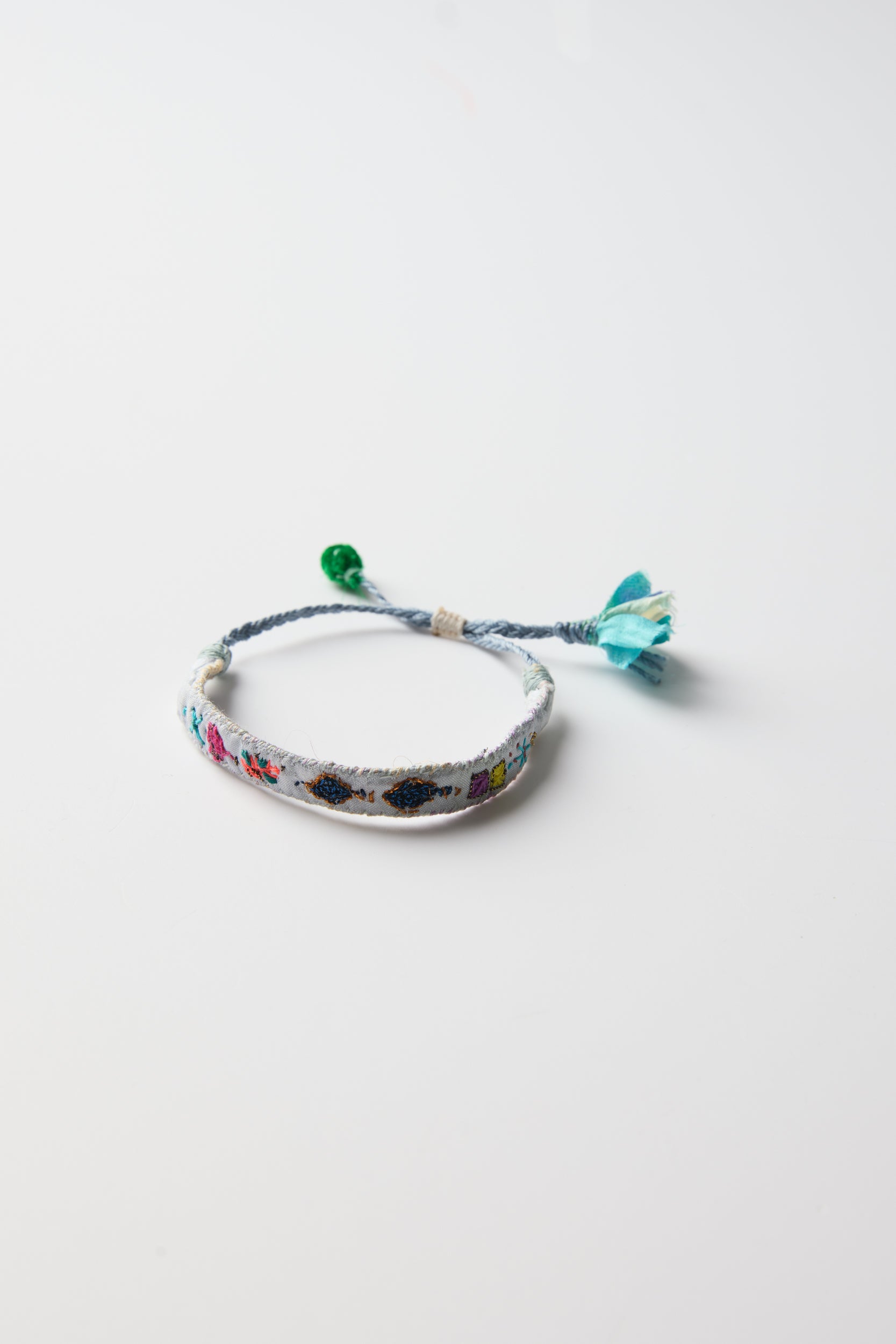 Embroidered bracelet by Antomoon. One of a kind, hand embroidered colorful bracelets made from hand dyed recycled silk from a sari. Embroidered with lovely little characters and motifs. Adjustable strap with a flower-like finish.