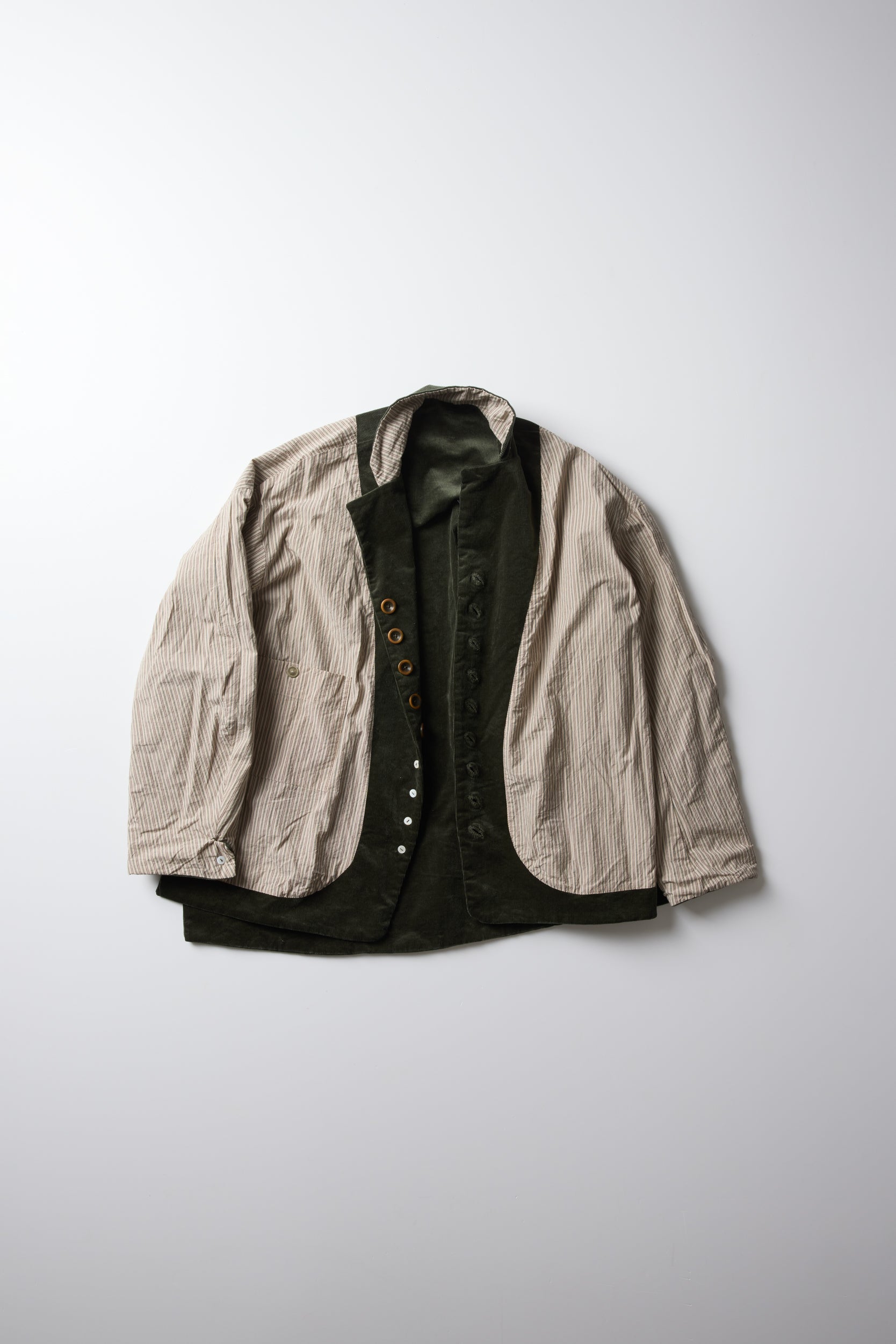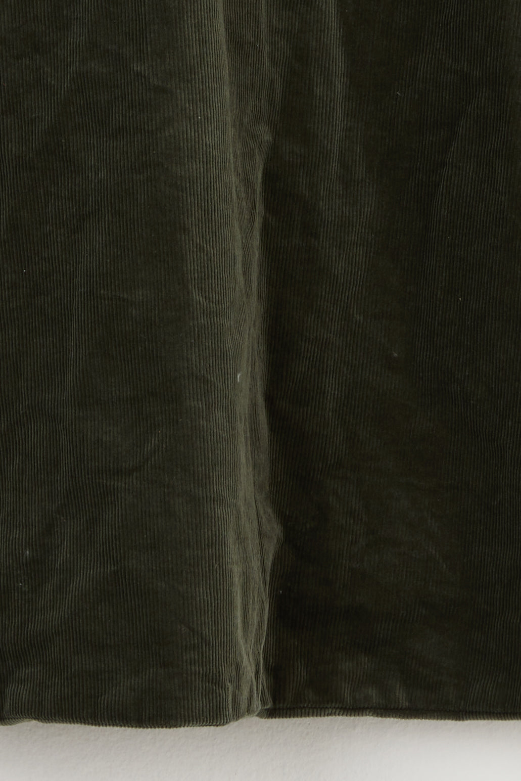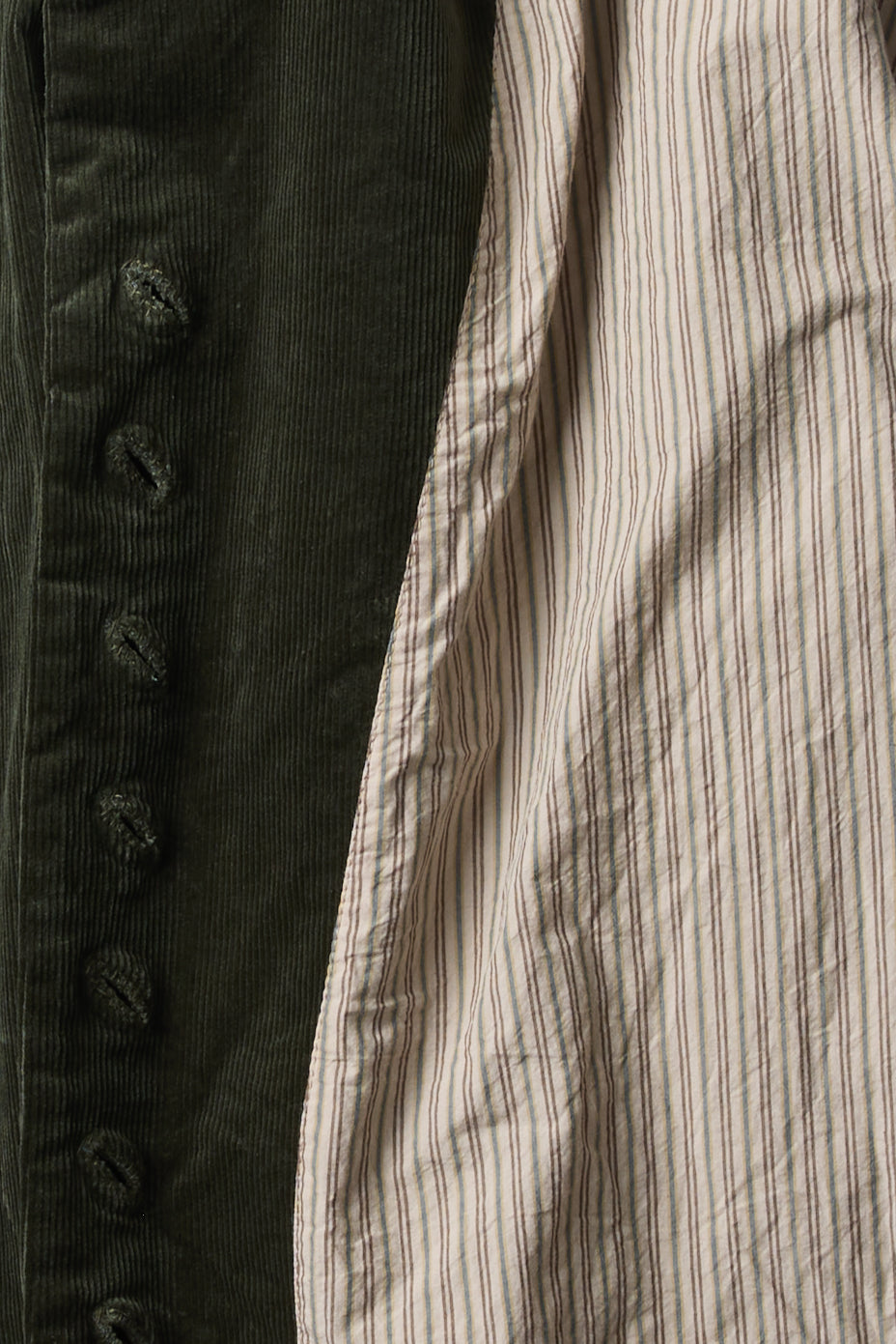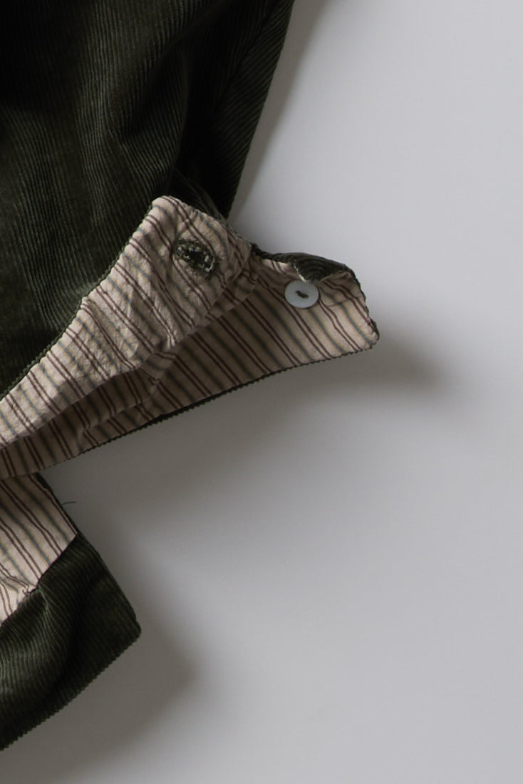 Frank corduroy jacket by Maya Zukerman. A wide and short lined corduroy jacket. Relaxed, boxy fit with striped cotton lining, dropped shoulders, a shorter front side and an upright collar. Features Corozo button closure and hand embroidered button holes. This jacket also has Side slits and two front patch pockets.