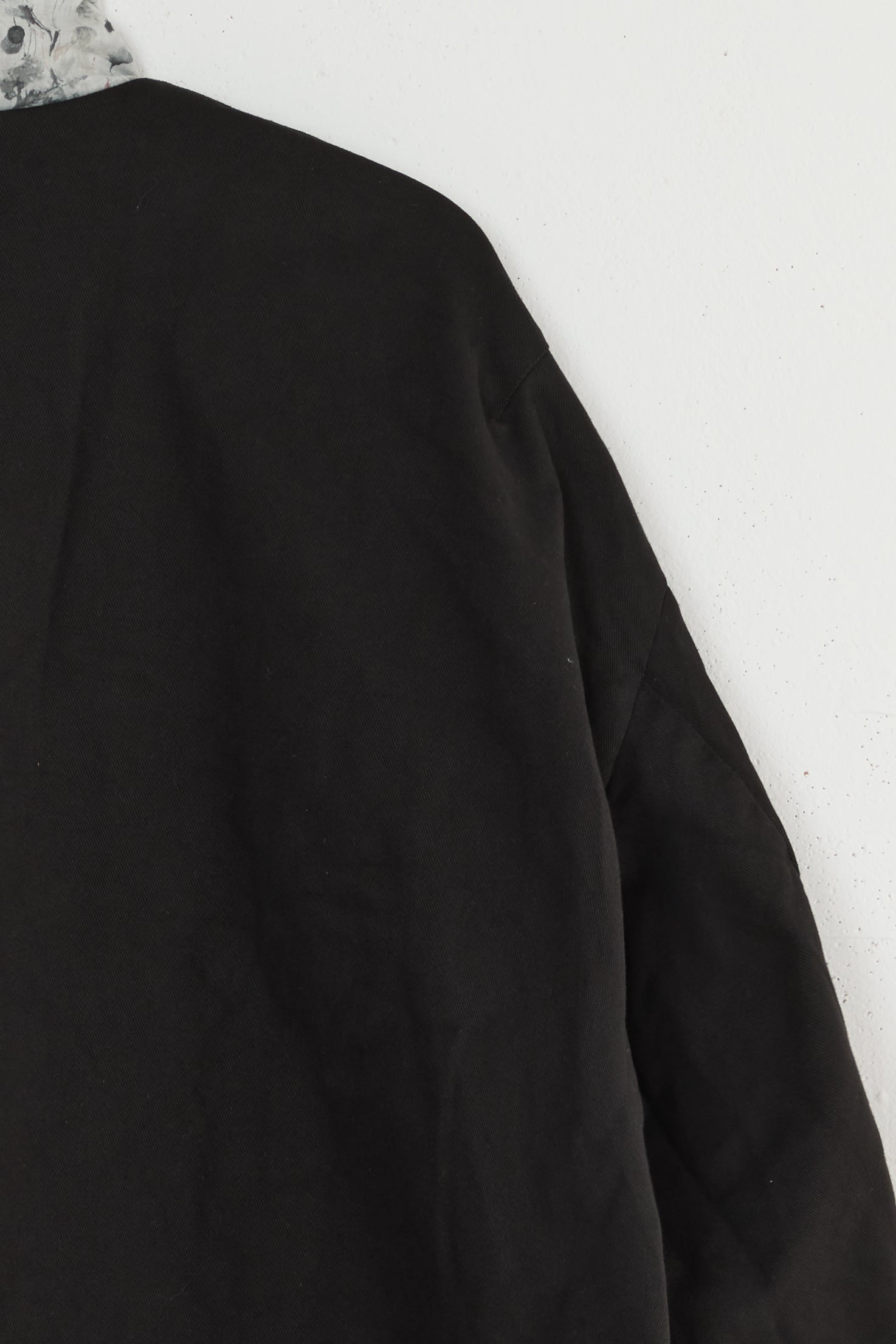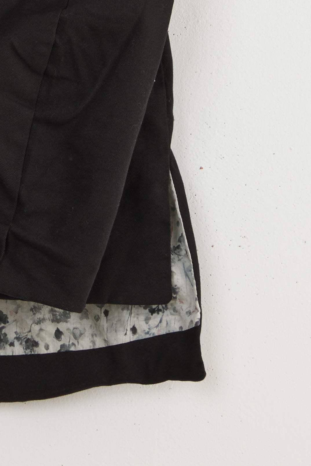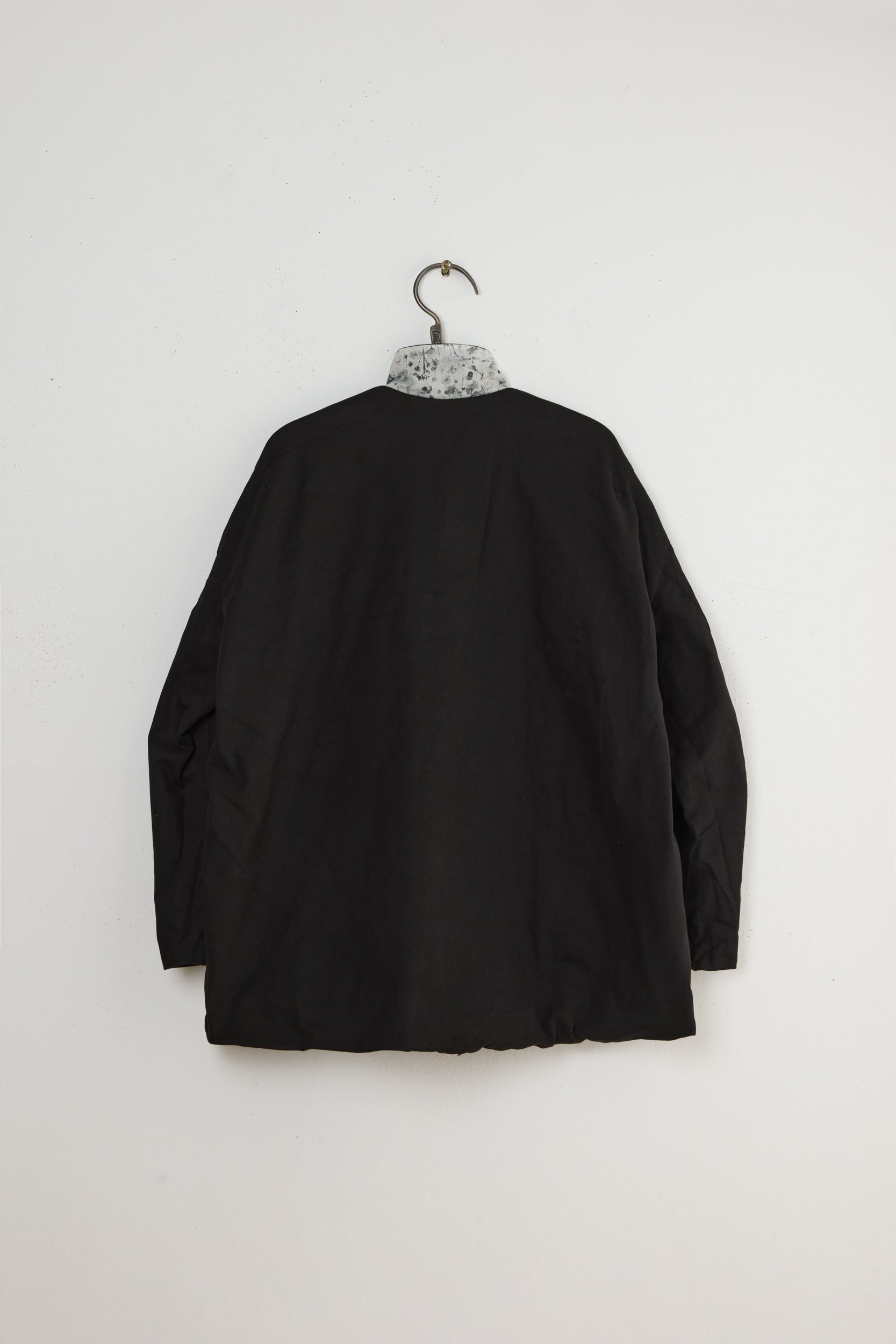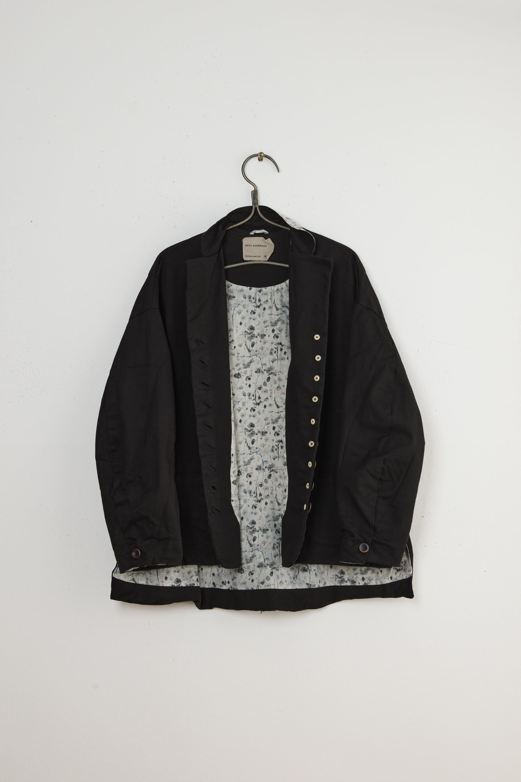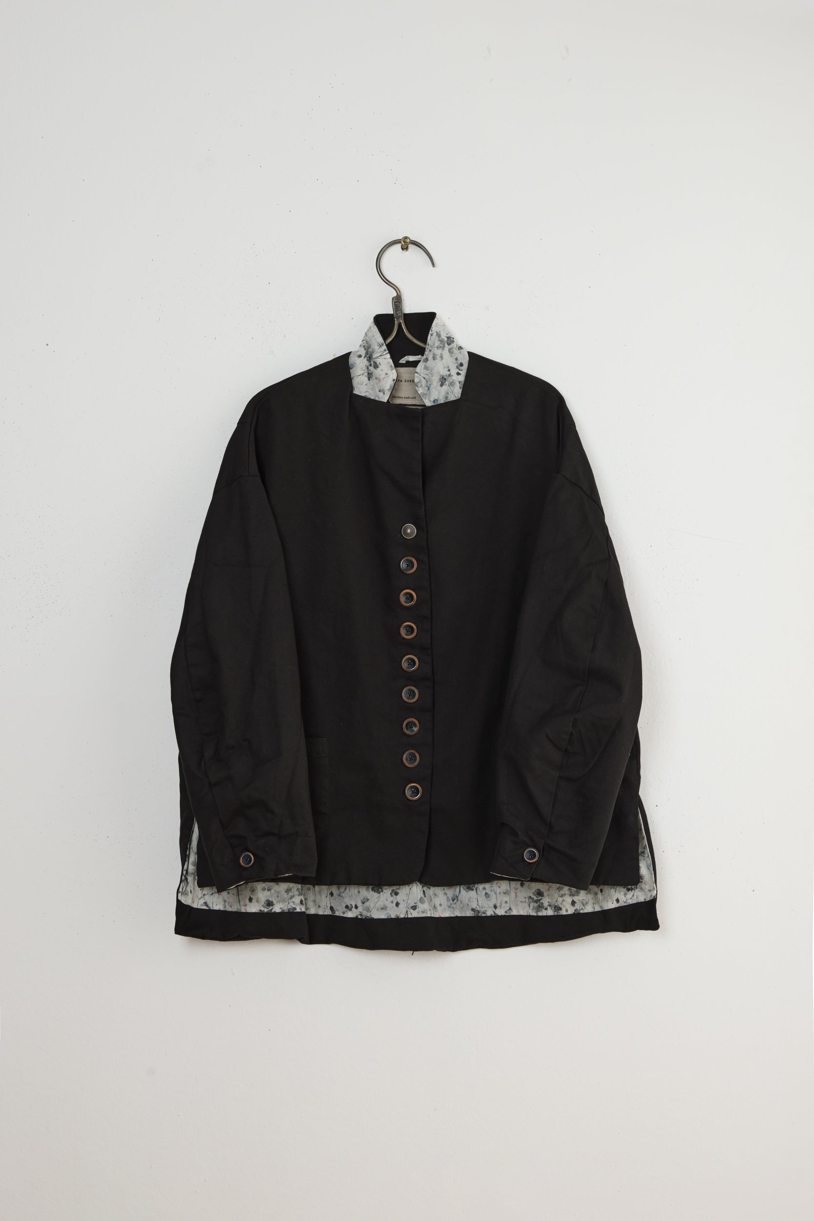 Frank jacket by Maya Zukerman. A wide and short lined cotton jacket. Relaxed, boxy fit with floral printed lining, dropped shoulders, a shorter front side and an upright collar. Features Corozo button closure and hand embroidered button holes. This jacket also has Side slits and two front patch pockets.