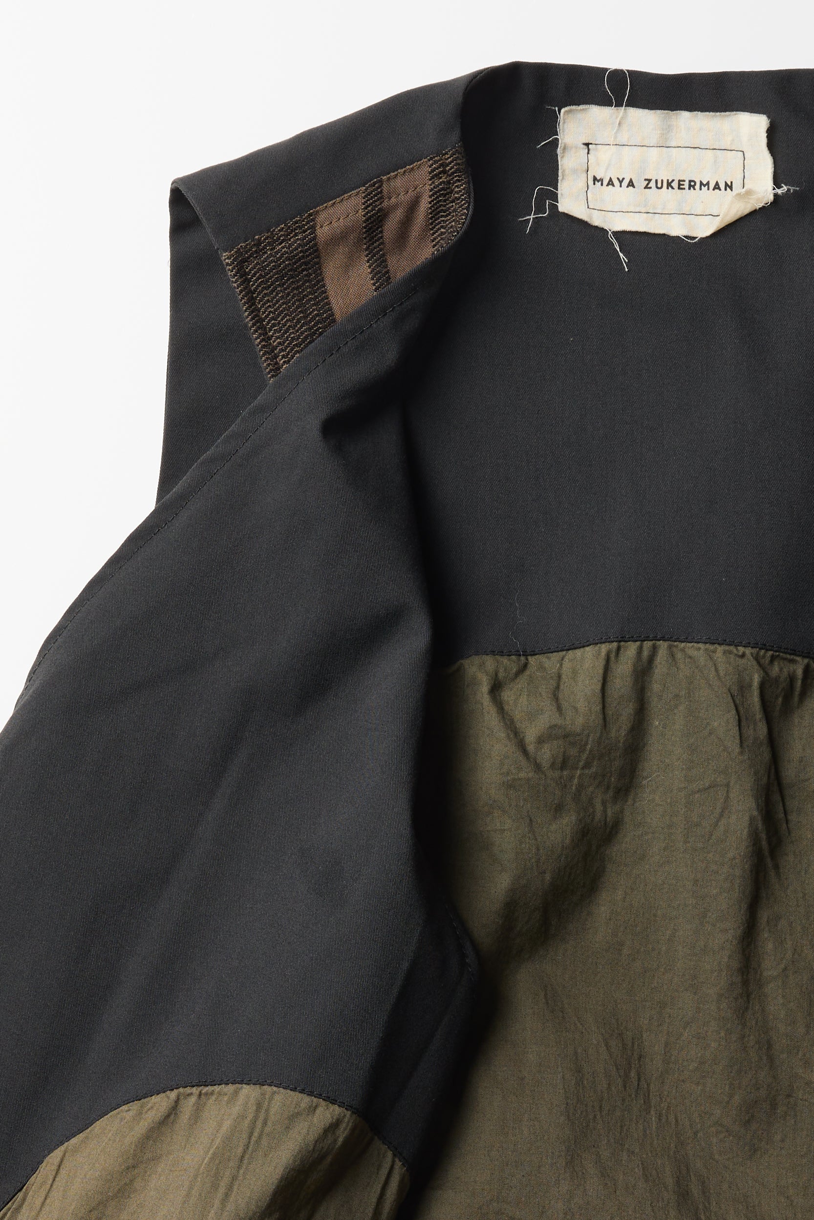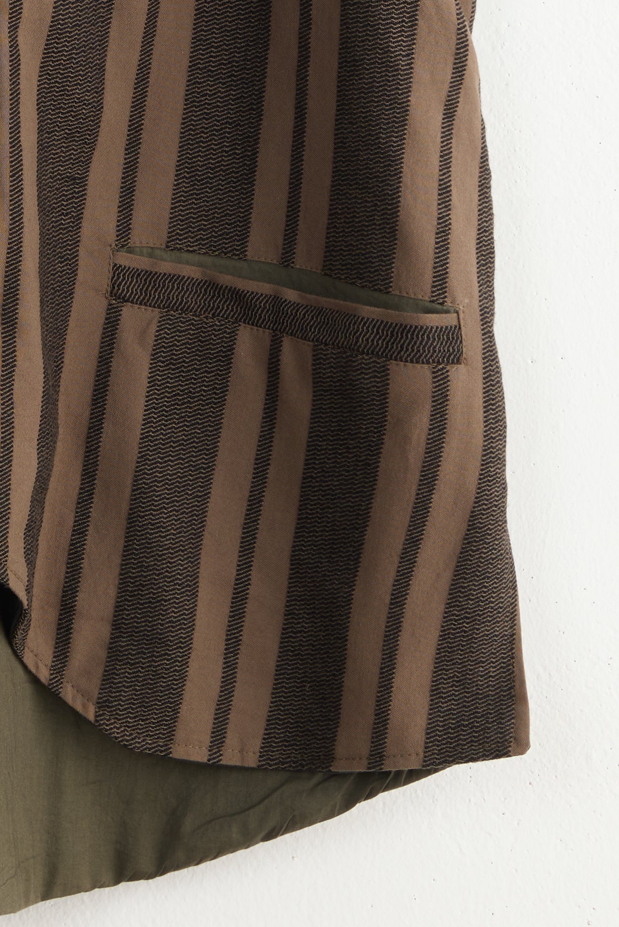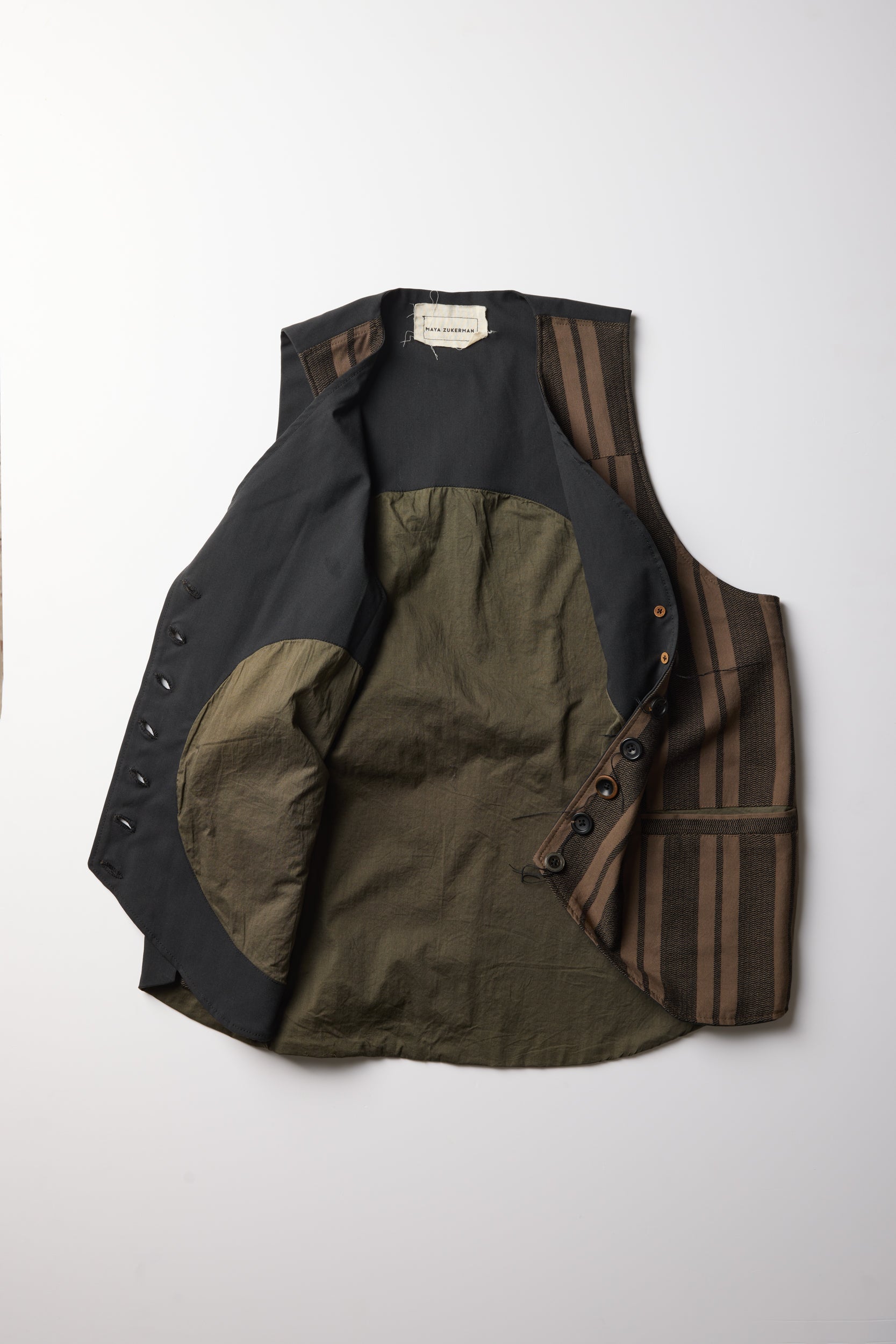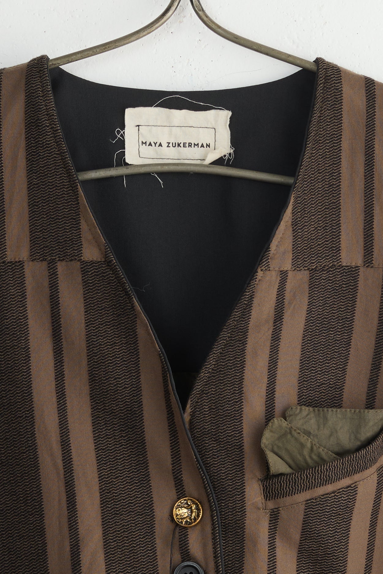 Heathcliff waistcoat by Maya Zukerman. A one of a kind vest made from up-cycled wool with striped pattern. Relaxed, slightly long silhouette with mismatched vintage buttons, hand stitched lopsided button holes and visible thread details. It has three welt pockets, rounded lining and ribbon fastening at the back. Very limited stock, each piece is slightly different and unique.