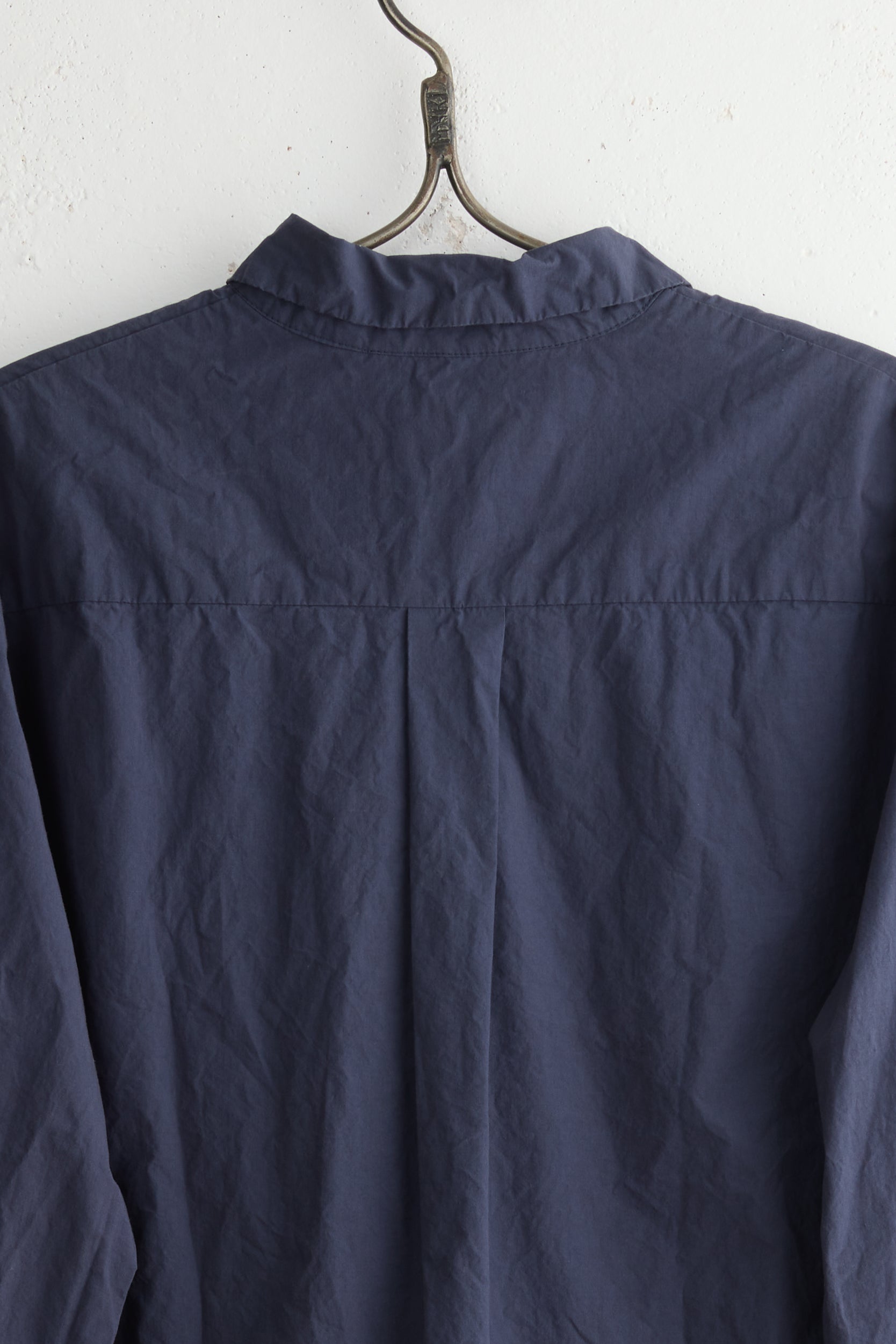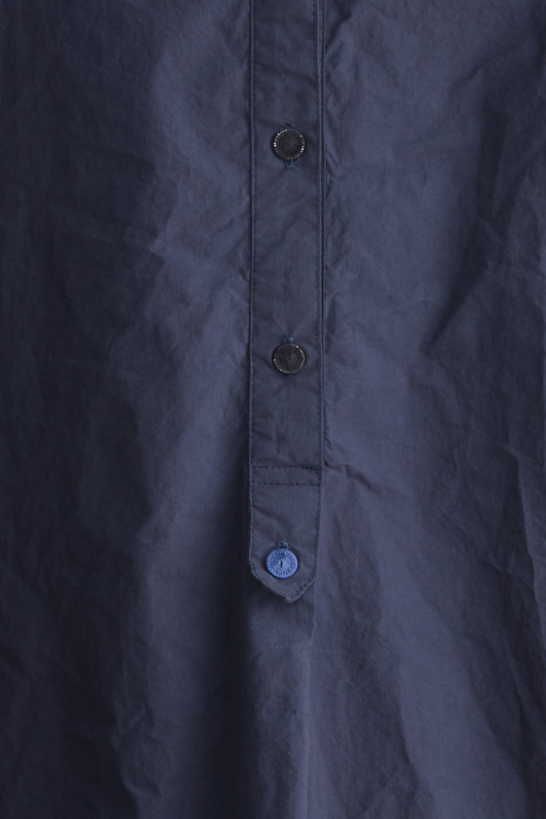 Lipp shirt by Maya Zukerman. A collared henley tunic made from lightweight Japanese paper cotton. Long and narrow silhouette with long cuffed sleeves, rounded hems with side slits, decorative tad beneath the button row and a decorative pleat on the back.