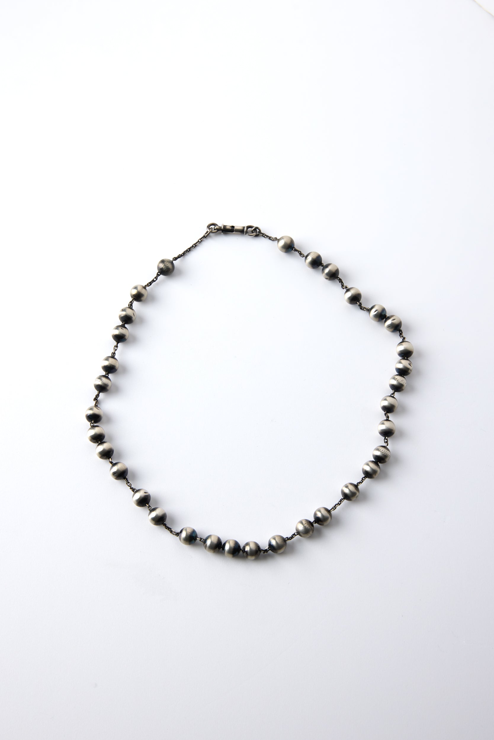 Pearl necklace by WERKSTATT:MUNCHEN. A Silver pearl necklace crafted to seem like they were randomly threaded onto a curb chain. Like their natural counterparts, the pearls have slight irregularities and scratches. The necklace opens with a twisting bayonet closure, developed in house.