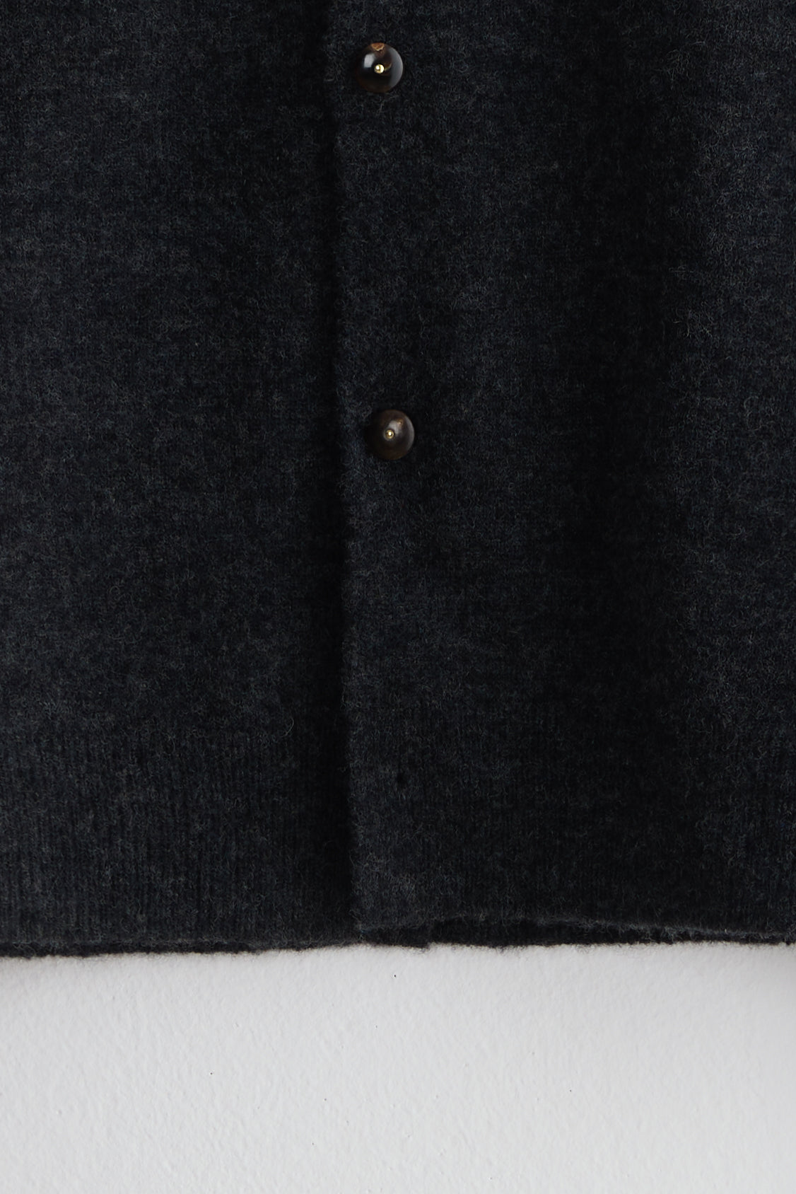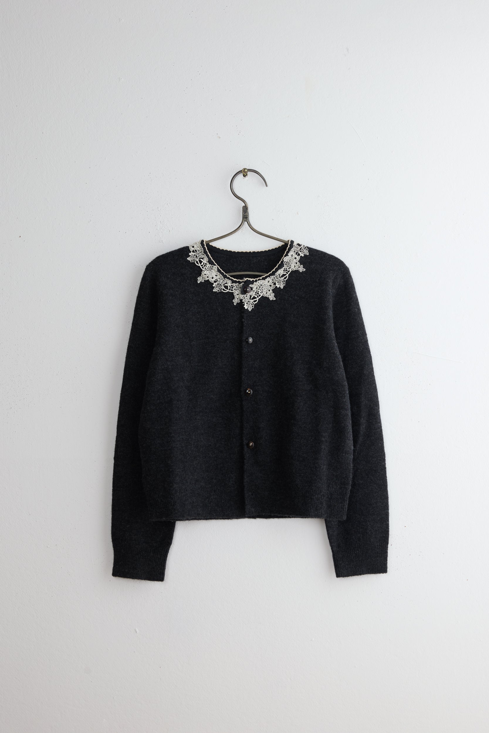 Lace neck cardigan by Renli su. An adorned knitted jumper made from a soft wool blend. regular fit with lace apliqué around the neck, button closure and ribbed hems and cuffs.