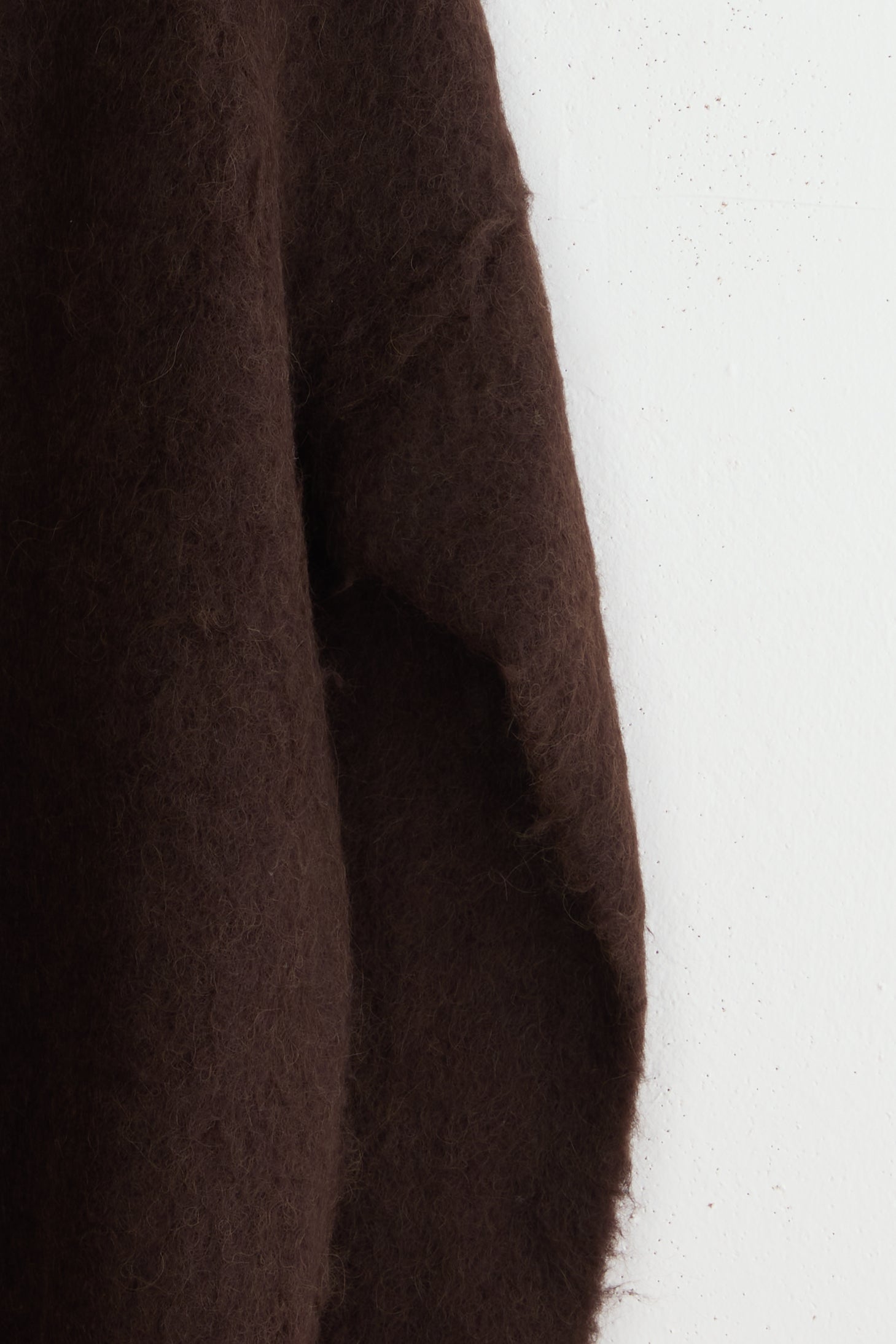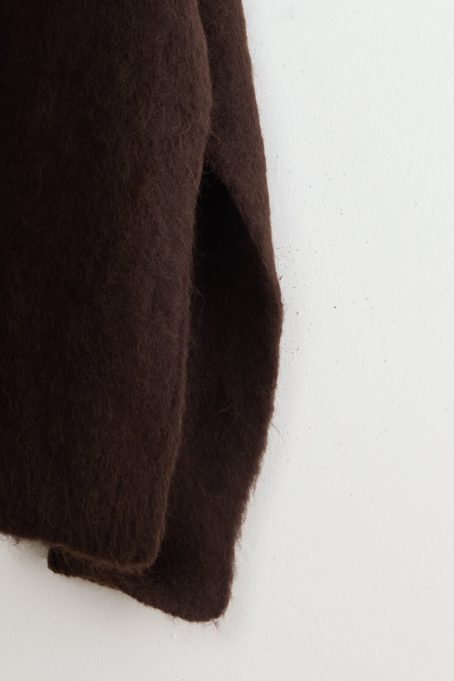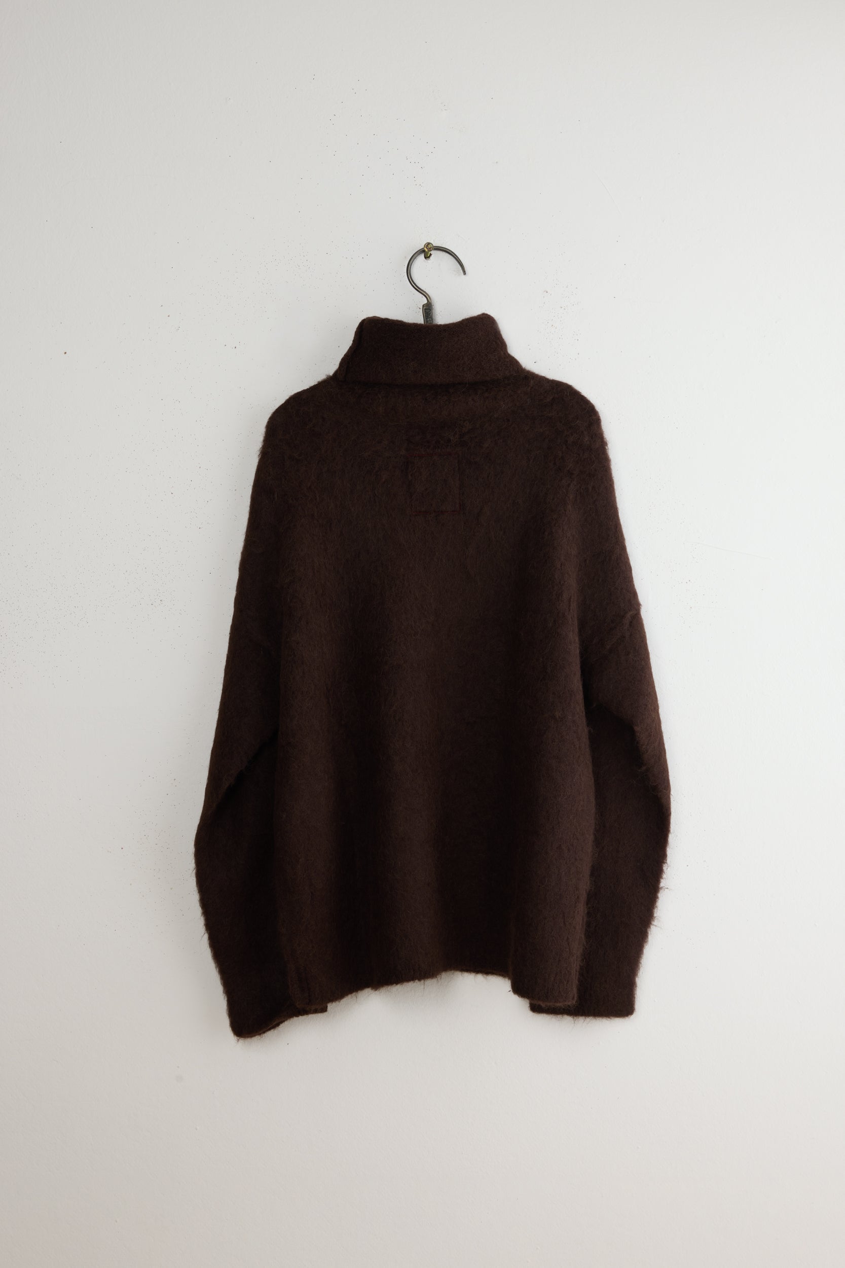 Brush HN pullover from house of Chinese designer Uma Wang. A fluffy turtleneck pullover sweater made from a super soft alpaca wool blend. Relaxed fit with high neck and super long sleeves.
