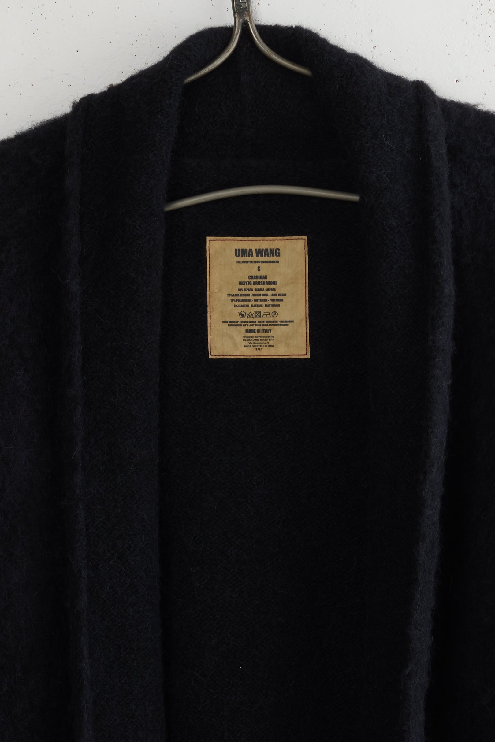 Brush cardigan from house of Chinese designer Uma Wang. A fluffy belted cardigan made from a super soft alpaca wool blend. Regular fit with open front, self tie belt, super long sleeves and patch pockets.